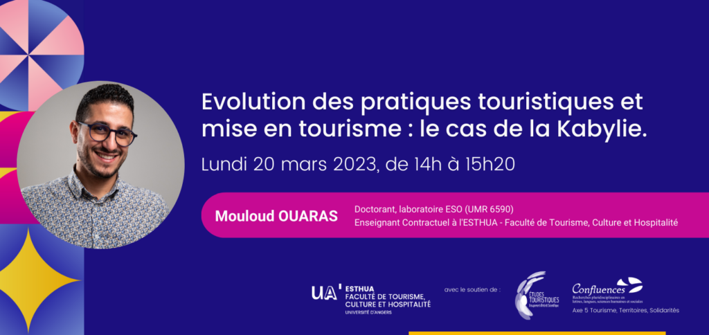 Le prochain Séminaire de Recherche en Tourisme, organisé par l’ESTHUA-Faculté de Tourisme, Culture et Hospitalité, avec le soutien du GIS Études touristiques et de l’axe 5 de la SFR Confluences, aura lieu lundi prochain, 20 mars, de 14h à 15h20, à l’ESTHUA (Angers, Campus Saint-Serge), en salle 302.